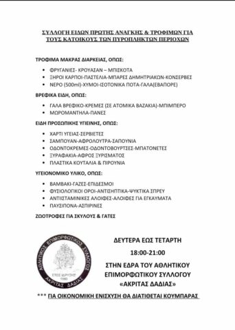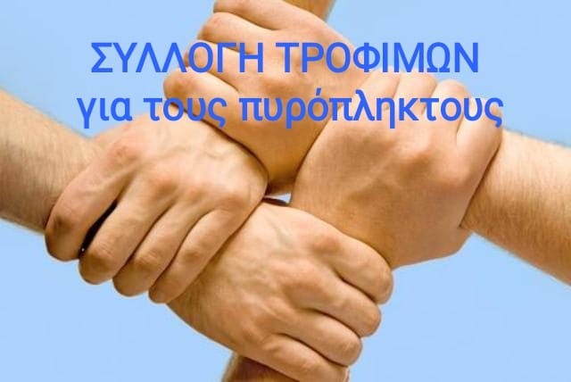 Επειδή πρέπει αυτές τις δύσκολες ώρες να δείξουμε την αλληλεγγύη και την συμπαράσταση μας στους συμπολίτες μας που κινδύνεψαν και είδαν τους κόπους μιας ζωής να καταστρέφονται από την πύρινη λαίλαπα προχωρούμε στην συλλογή ειδών πρώτης ανάγκης και συγκεκριμένα: