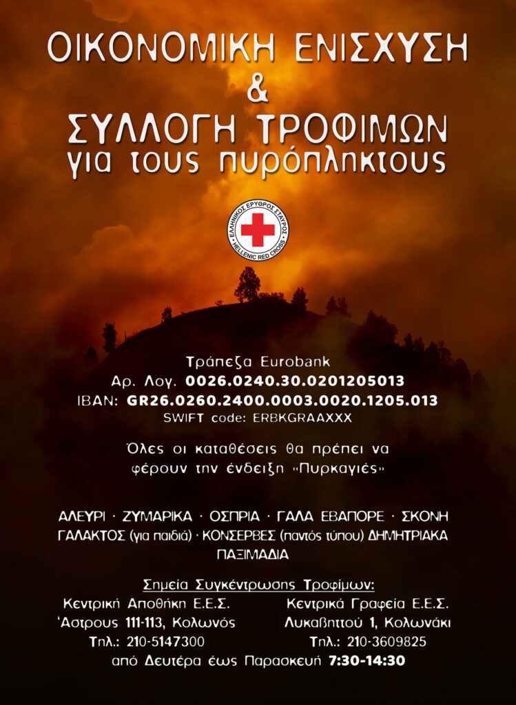 Ο Ελληνικός Ερυθρός Σταυρός, αναγνωρίζοντας τη κρισιμότητα της κατάστασης και τις τεράστιες ανάγκες που έχουν προκύψει από τις μεγάλης έκτασης φωτιές σε Βαρυμπόμπη, Πάτρα, Ρόδο, Β. Εύβοια, Αρχαία Ολυμπία, διευρύνει το κάλεσμα του στον κόσμο για συγκέντρωση χρημάτων και τροφίμων προς τους πυρόπληκτους όλων των παραπάνω περιοχών.