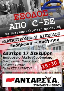 Με το ερώτημα αυτό καλεί η ΑΝΤΑΡΣΥΑ Αλεξ/πολης τους εργαζόμενους και τη νεολαία της πόλης, τους αγωνιστές των κινημάτων και το δυναμικό των εργατικών αγώνων του προηγούμενου διαστήματος, αλλά και όλες τις μαχόμενες δυνάμεις της Αριστεράς σε εκδήλωση – συζήτηση τη Δευτέρα 17 Δεκέμβρη στις 6.30μμ στο Δημαρχείο.