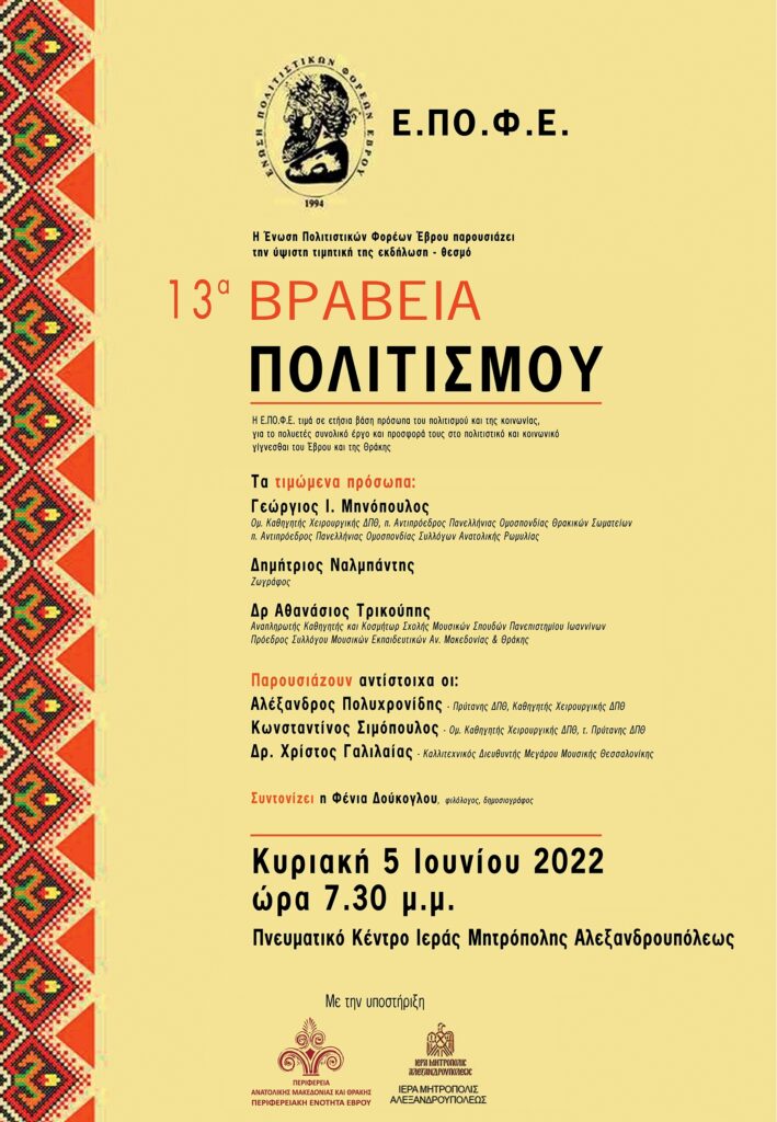 Τα 13α Βραβεία Πολιτισμού πραγματοποιούνται με την υποστήριξη της Ιεράς Μητρόπολης Αλεξανδρουπόλεως και της Περιφέρειας Ανατολικής Μακεδονίας και Θράκης / Περιφερειακή Ενότητα Έβρου, καθώς και τη συνεργασία του Μουσικού Σχολείου Αλεξανδρούπολης.