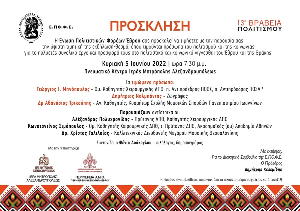 Η Ένωση Πολιτιστικών Φορέων Έβρου σας προσκαλεί να τιμήσετε με την παρουσία σας το πολυδιάστατο ποιοτικό πολιτιστικό γεγονός, που διοργανώνει και φέρει τον τίτλο «ΒΡΑΒΕΙΑ ΠΟΛΙΤΙΣΜΟΥ»