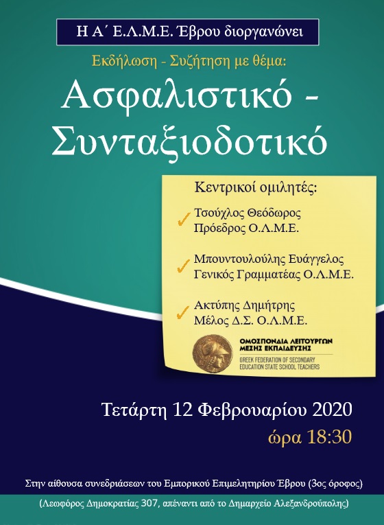 Την Τετάρτη 12 Φεβρουαρίου 2020 και ώρα 18:30 στην αίθουσα συνεδριάσεων του Εμπορικού Επιμελητηρίου Έβρου, η Α΄ Ε.Λ.Μ.Ε. Έβρου διοργανώνει εκδήλωση – συζήτηση με θέμα το ασφαλιστικό – συνταξιοδοτικό.