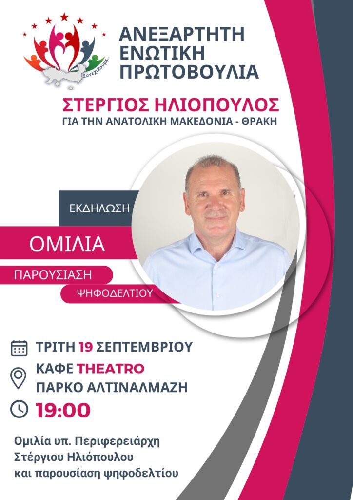 Η Ανεξάρτητη Ενωτική Πρωτοβουλία, για την Ανατολική Μακεδονία – Θράκη, σας καλεί στην κεντρική ομιλία του υποψήφιου Περιφερειάρχη κ. Στέργιου Ηλιόπουλου, την Τρίτη 19 Σεπτεμβρίου και ώρα 19:00, στο Καφέ THEATRO, του Πάρκου Αλτιναλμάζη.