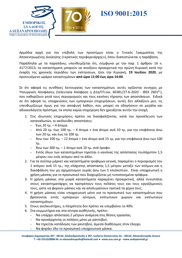 Υπενθυμίζεται σε ότι αφορά τις συνθήκες λειτουργίας των καταστημάτων, αυτές ορίζονται συνεχώς με Υπουργικές Αποφάσεις (τελευταία Απόφαση η Δ1α/ΓΠ.οικ. 40381/27-6-2020 – ΦΕΚ 2601Β΄), που καθορίζουν ρητά τους περιορισμούς και τους κανόνες τήρησης των αποστάσεων.