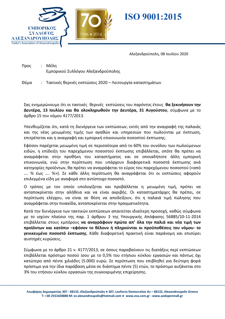 Για την έναρξη και διάρκεια των τακτικών θερινών εκπτώσεων ενημερώνει με ανακοίνωσή του ο Εμπορικός Σύλλογος Αλεξανδρούπολης