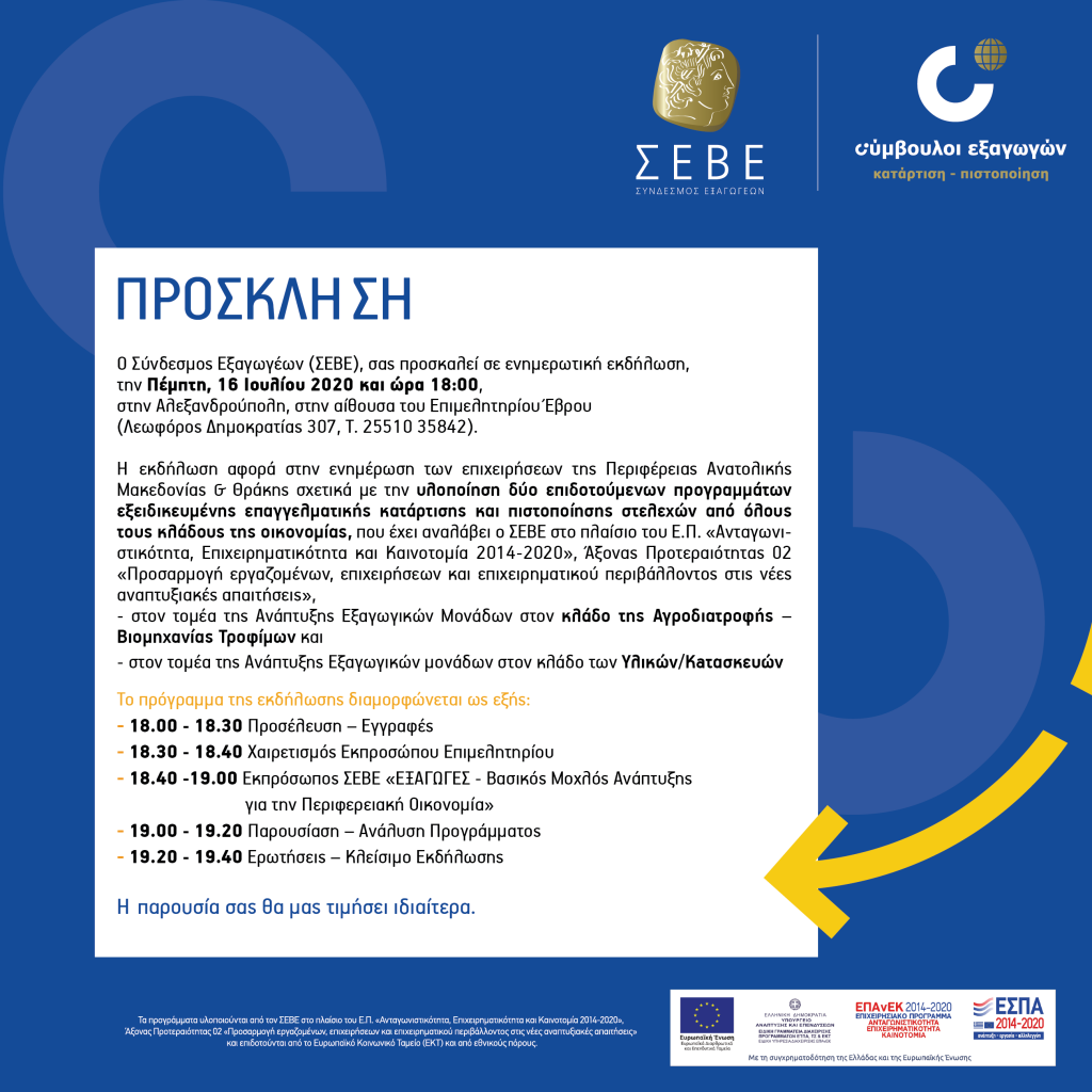Ενημερωτική εκδήλωση σχετικά με την υλοποίηση δύο νέων επιδοτούμενων προγραμμάτων επαγγελματικής εξειδίκευσης πραγματοποιεί ο ΣΕΒΕ, την Πέμπτη 16 Ιουλίου 2020 και ώρα 18:00, στην Αλεξανδρούπολη, στην αίθουσα του Επιμελητηρίου Έβρου.