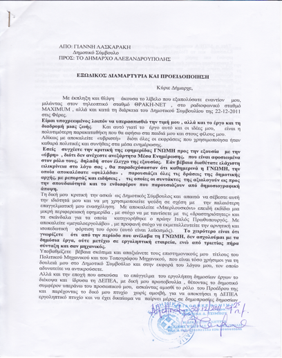Βέβαια ανάλογη εξυβριστική συμπεριφορά επιδείξατε για το πρόσωπό μου και σε άλλα άρθρα της εφημερίδας σας. Χαρακτηριστικά δε αναφέρω ότι την 2/09/2011, όπου με ειρωνεία, χολή και απαξίωση προσπαθήσατε να μειώσετε την αποστολή μέχρι τότε (4) τεσσάρων επιστολών μου προς όργανα της πολιτείας, έχων δικαίωμα και υποχρέωση, ως Δήμαρχος, προκειμένου να υπερασπιστώ το δημοτικό συμφέρον, εσείς με αποκαλέσατε «επιστολογράφο», δηλαδή άνθρωπο που δεν αντιλαμβάνεται τον χώρο και τον ρόλο του, είτε ζηλεύοντας την απήχηση που είχαν οι ενέργειές μου και την αποτελεσματικότητα ως προς την επιδίωξη των συμφερόντων των δημοτών, είτε διότι εξαιτίας της καισαρικής σας συμπεριφοράς και νοοτροπίας, ξεχάσατε ότι δεν ασκώ διακονία διοικώντας τον Δήμο σύμφωνα με το δικό σας μυαλό και πρόγραμμα, αλλά με αυτό της παράταξής μου, που ενέκρινε ο λαός, απορρίπτοντας το δικό σας πρόγραμμα.