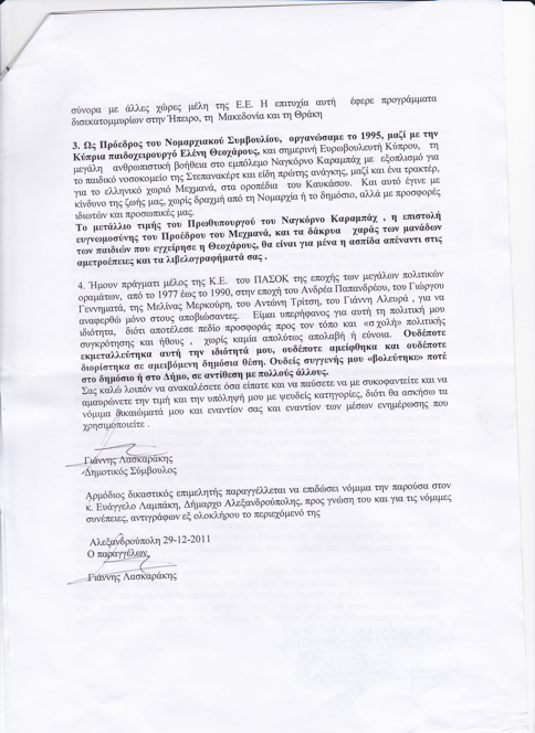 Όμως ο έλεγχος της εξουσίας και των θεσμικών, δεν γίνεται με ύβρεις και συκοφαντίες. Ασφαλώς και οφείλετε (και όχι μόνο δικαιούστε), να ελέγχετε την εξουσία και τους θεσμικούς, όχι όμως υβρίζοντας και συκοφαντώντας. Διότι κύριε Λασκαράκη, με το να αναγράψετε στο κύριο άρθρο της εφημερίδας σας στις 22/12/2011 «διαπλοκή στο Δήμο Αλεξανδρούπολης» και «συναλλαγή κάτω από το τραπέζι» είναι εξυβριστικό του προσώπου μου και συκοφαντικό συγχρόνως, και το γνωρίζετε καλώς, διότι οι χαρακτηρισμοί σας αυτοί αφορούσαν μία νόμιμη ανάθεση εργασίας κάλυψης της αδελφοποίησης με το Σοσνόβι Μπορ στην Αγία Πετρούπολη της Ρωσίας, την παραγωγή DVD και αποστολή διαφημιστικού υλικού από τον Δήμο μας στη Ρωσία, όταν μάλιστα η δαπάνη για την εργασία αυτή είχε ψηφισθεί και εγκριθεί ομόφωνα από όλες τις παρατάξεις στην οικονομική επιτροπή που έφερα το θέμα, χωρίς μάλιστα να έχω υποχρέωση.