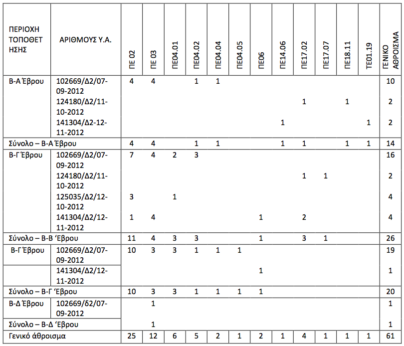 Στη Διεύθυνση Δευτεροβάθμιας Εκπαίδευσης Έβρου, για την κάλυψη των αναγκών σε εκπαιδευτικό προσωπικό Β/θμιας Εκπαίδευσης των σχολείων της Γενικής Αγωγής που υπάγονται στις αρμοδιότητες της εν λόγω Διεύθυνσης, έχουν πραγματοποιηθεί οι κατωτέρω αναφερόμενες προσλήψεις, κατά κλάδο και ειδικότητα και κατά περιοχή τοποθέτησης: