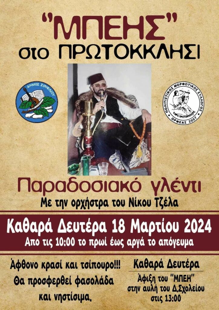 Καθαρά Δευτέρα 18/3/2024 στις 10.00 π.μ.. Το έθιμο του «Μπέη» αναβιώνει στο Πρωτοκκλήσι. Θα πραγματοποιηθεί παραδοσιακό γλέντι με την ορχήστρα του Νίκου Τζέλα. Θα προσφερθούν φασολάδα και νηστήσιμα. Η άφιξη του «Μπέη» θα πραγματοποιηθεί στην αυλή του Δημοτικού Σχολείου στη 13.00.