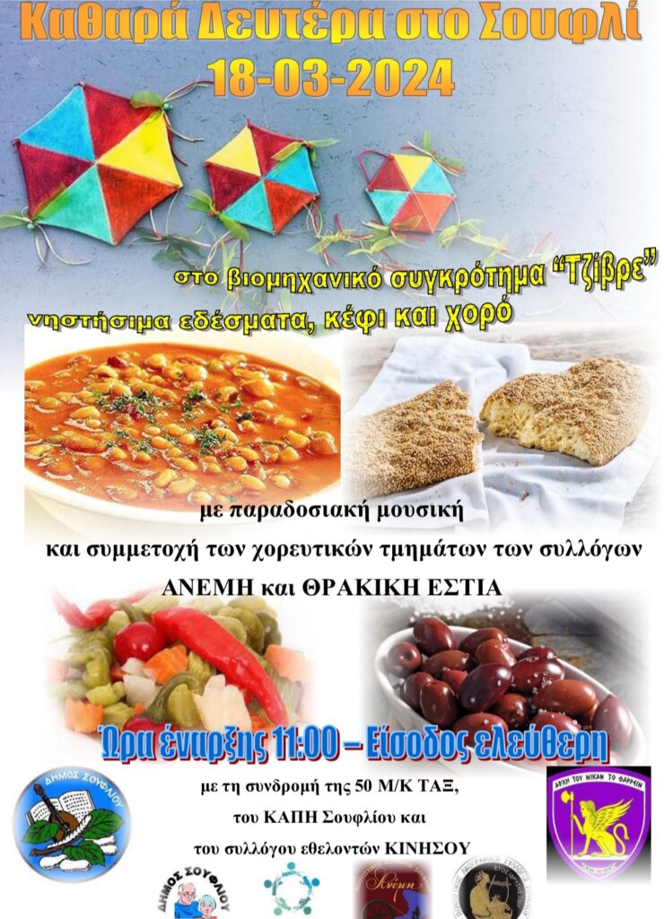 Καθαρά Δευτέρα 18/3/2024 ώρα έναρξης 11.00 π.μ.. Στο βιομηχανικό συγκρότημα «Τζίβρε» θα πραγματοποιηθούν τα «Κούλουμα» με νηστήσιμα εδέσματα, παραδοσιακή μουσική και συμμετοχή των συλλόγων ΑΝΕΜΗ και ΘΡΑΚΙΚΗ ΕΣΤΙΑ. Η είσοδος θα είναι ελεύθερη.