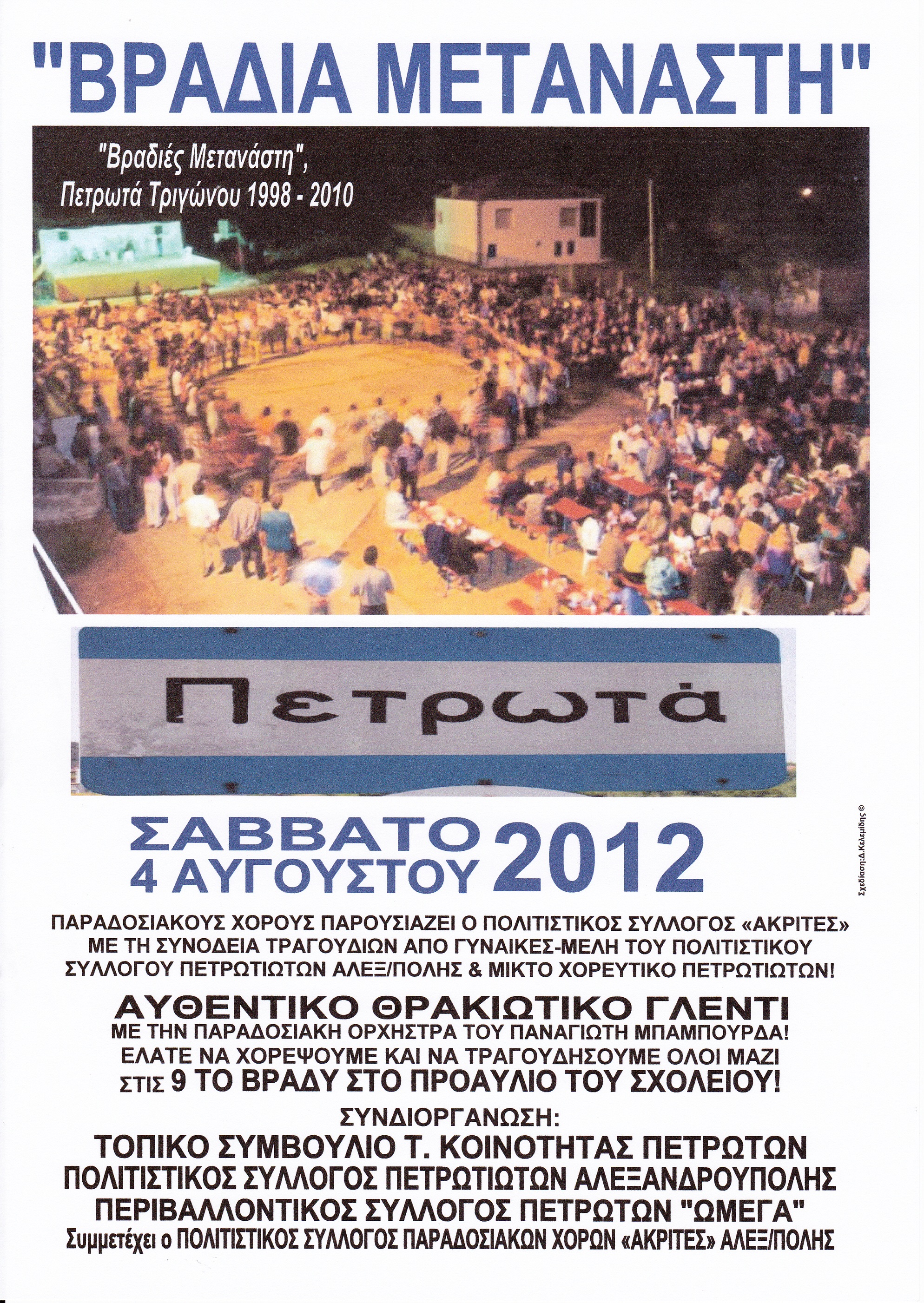 Καλούμε όλες τις σεβαστές μας Συμπατριώτισσες και όλους τους σεβαστούς μας Συμπατριώτες, καθώς και όλους τους Φίλους μας, να μας τιμήσετε με την παρουσία Σας, στην Παραδοσιακή Βραδιά, αφιερωμένη στα Αδέρφια μας συγχωριανούς, τόσο του Εξωτερικού όσο και του Εσωτερικού, που θα πραγματοποιηθεί στα Πετρωτά, το Σάββατο 4 Αυγούστου 2012 και από ώρα 8.30 το βράδυ, στο προαύλιο του σχολείου.