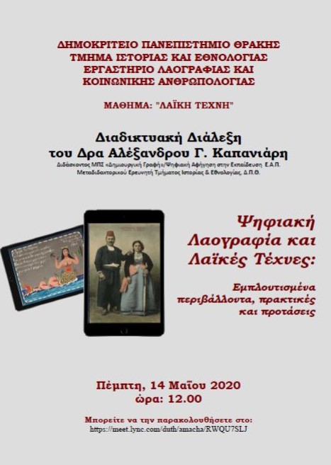 Στο πλαίσιο του μαθήματος “Λαϊκή Τέχνη” του Τμήματος Ιστορίας και Εθνολογίας του Δημοκρίτειου Πανεπιστημίου Θράκης και σε συνεργασία με το Εργαστήριο Λαογραφίας και Κοινωνικής Ανθρωπολογίας θα πραγματοποιηθεί την Πέμπτη, 14 Μαΐου 2020, και ώρα 12:00, από τον Δρα Ψηφιακής Λαογραφίας Αλέξανδρο Καπανιάρη, διαδικτυακή διάλεξη με τίτλο: Ψηφιακή Λαογραφία και Λαϊκές Τέχνες: Εμπλουτισμένα Περιβάλλοντα, Πρακτικές και Προτάσεις.