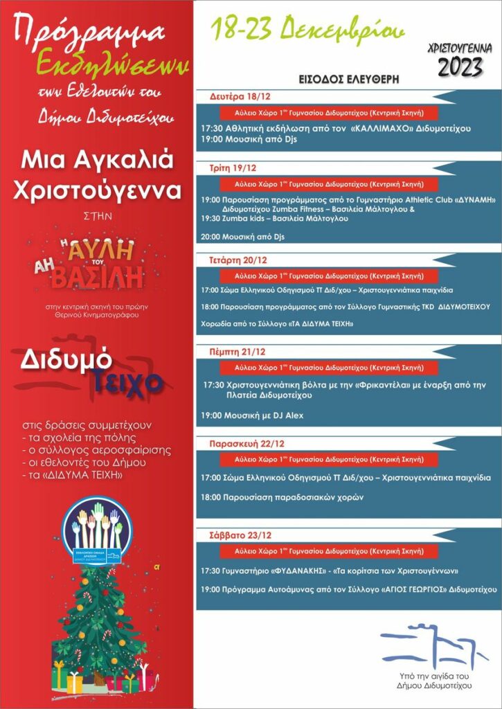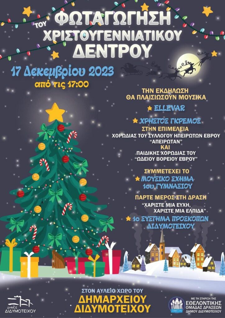 Η φωταγώγηση του χριστουγεννιάτικου δέντρου θα πραγματοποιηθεί την Κυριακή 17 Δεκεμβρίου 2023 και ώρα 17:00 μ.μ. στον αύλειο χώρο του Δημαρχείου Διδυμοτείχου με ζωντανή μουσική, πολλές εκπλήξεις για τους μικρούς φίλους, και μετά το πέρας της φωταγώγησης η “Αυλή του Άη Βασίλη” ανοίγει τις πύλες της και στον αύλειο χώρο του 1ου Γυμνασίου (πρώην θερινό κινηματογράφο) με πολλές δράσεις, σε διοργάνωση του Εκπολιτιστικού Συλλόγου “Τα Δίδυμα Τείχη” με την στήριξη του Δήμου Διδυμοτείχου και με την συμμετοχή πολλών συλλόγων, σωματείων και φορέων.