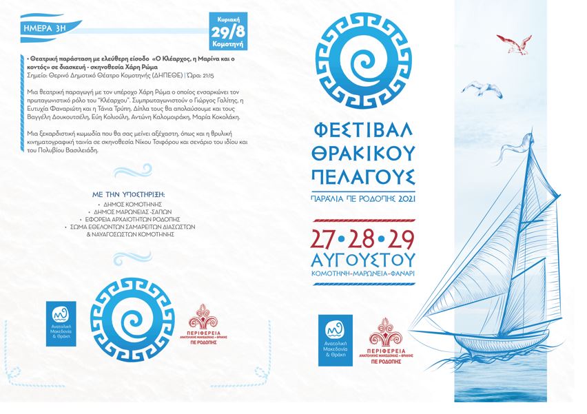 Η Περιφέρεια ΑΜΘ για τρίτη χρονιά διεξάγει το περιφερειακό φεστιβάλ Θρακικού Πελάγους, στοχεύοντας στην ιστορική, πολιτισμική, οικολογική, τουριστική, εμπορική και εν γένει την γεωπολιτική σημασία της περιοχής για την ανάπτυξή της. Στην Περιφερειακή Ενότητα Ροδόπης, το 3ο Φεστιβάλ Θρακικού Πελάγους πρόκειται να πραγματοποιηθεί στα φυσικά μέρη της Μαρώνειας και του Φαναρίου κατά το τριήμερο 27, 28 και 29 Αυγούστου 2021.