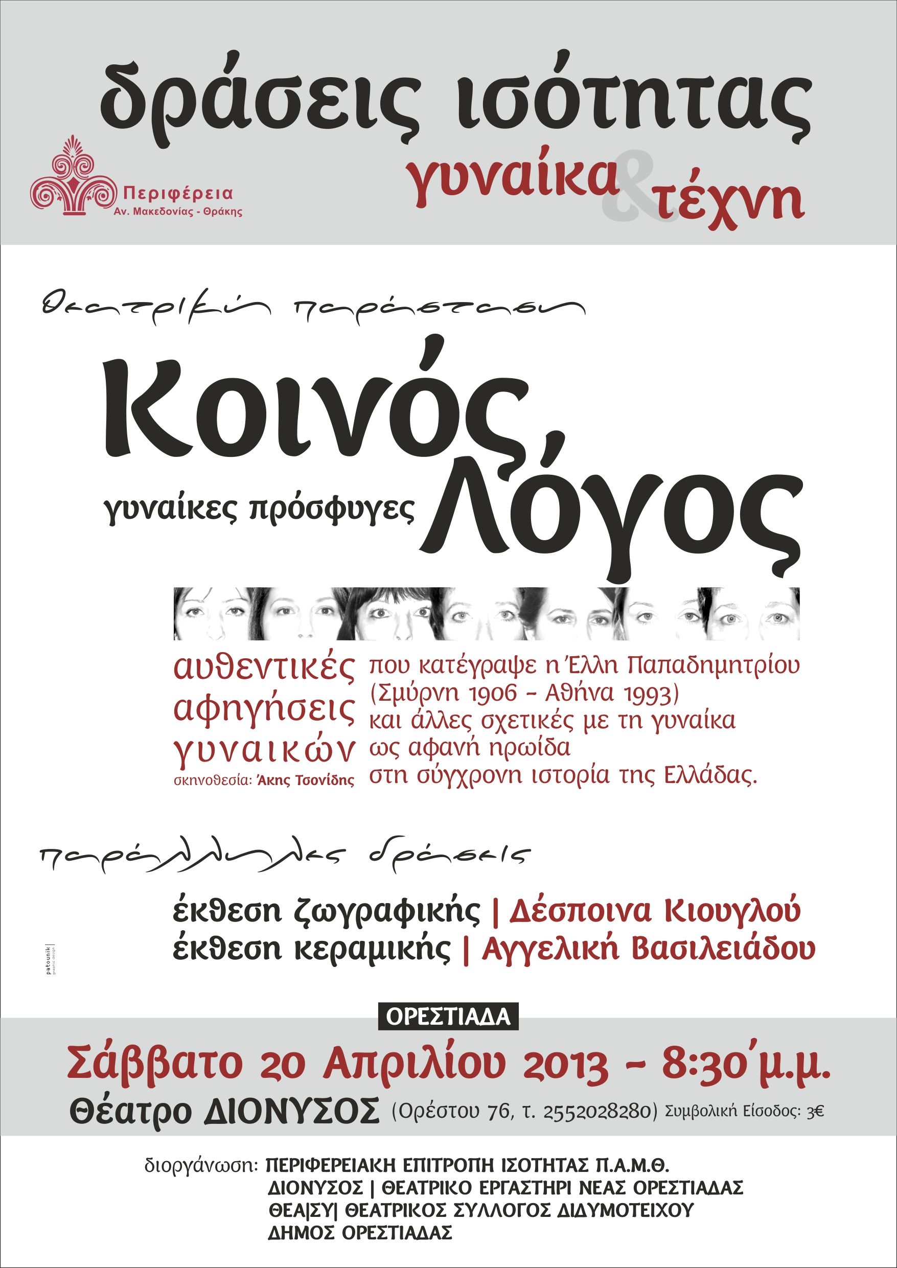 ü Θα παρουσιασθούν Θεατρικοί μονόλογοι για τις γυναίκες πρόσφυγες σε κείμενα της Έλλης Παπαδημητρίου από το έργο της «ο κοινός λόγος». Την παράσταση σκηνοθετεί ο Άκης Τσονίδης.