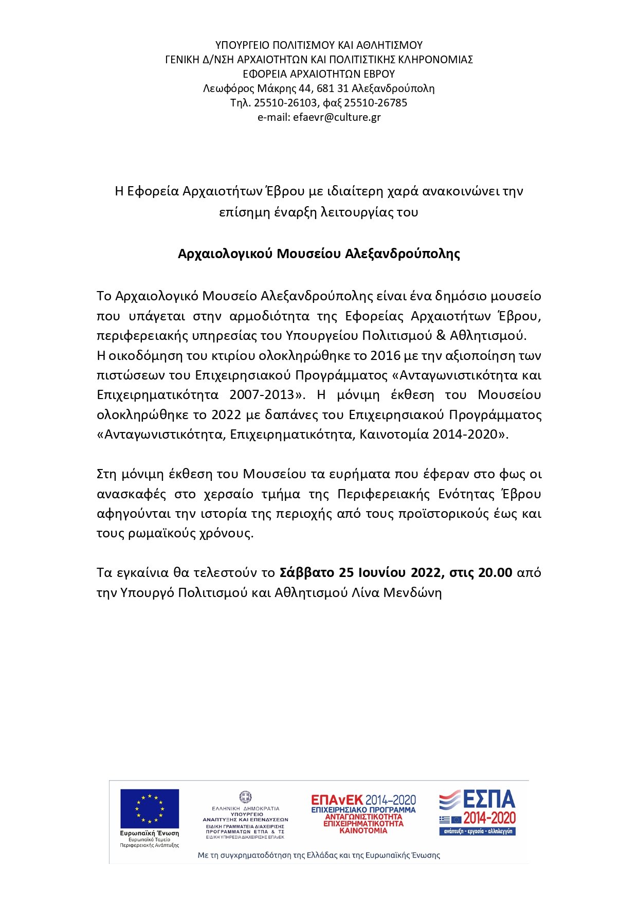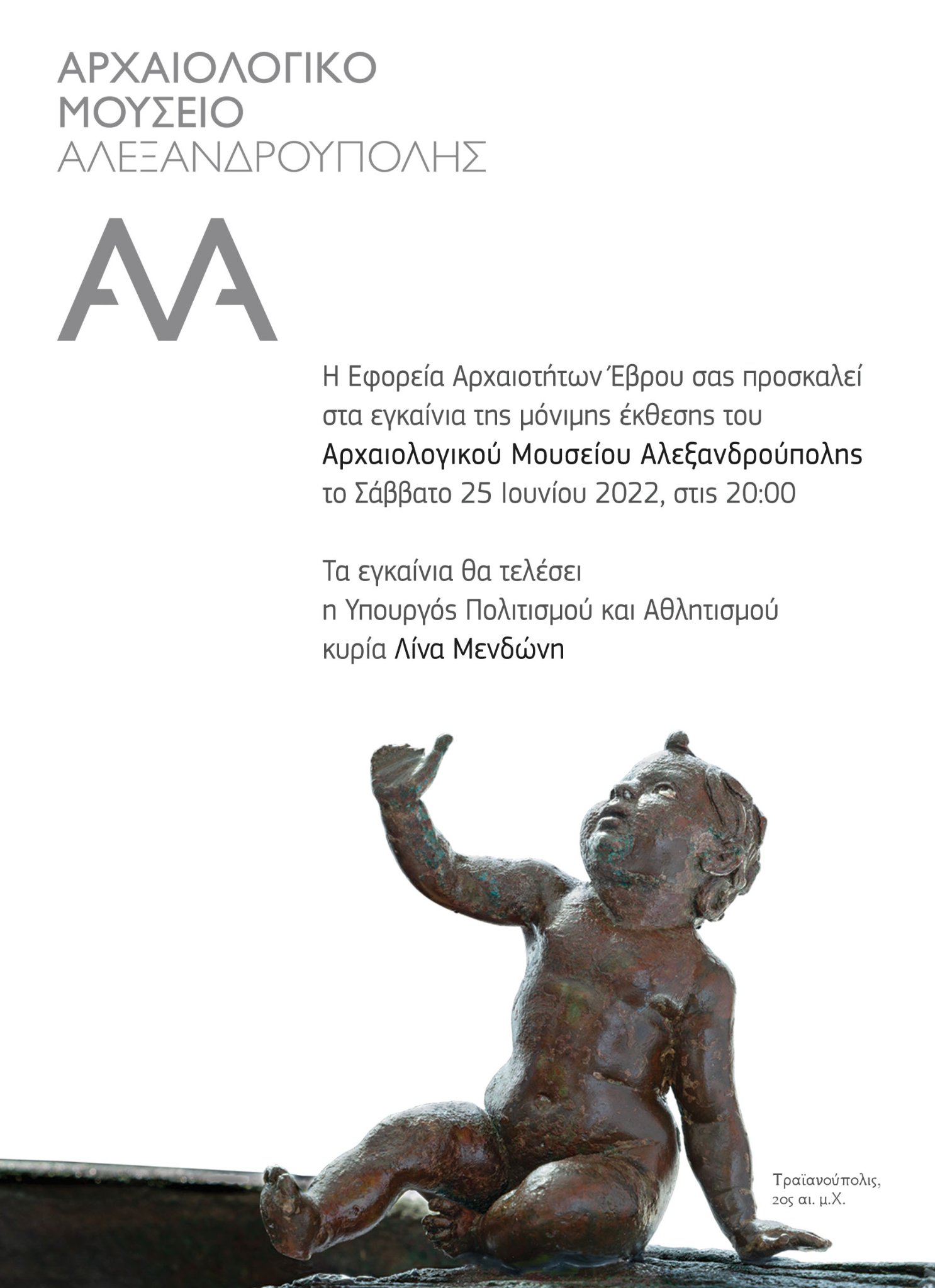 Η Εφορεία Αρχαιοτήτων Έβρου με ιδιαίτερη χαρά ανακοινώνει την επίσημη έναρξη λειτουργίας του Αρχαιολογικού Μουσείου Αλεξανδρούπολης