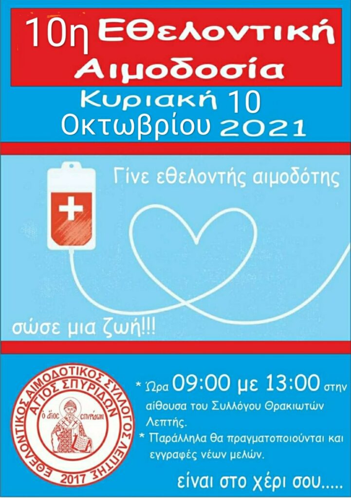 10η Εθελοντική αιμοδοσία από τον Εθελοντικό Αιμοδοτικό Σύλλογο Άγιος Σπυρίδων στην Λεπτή
