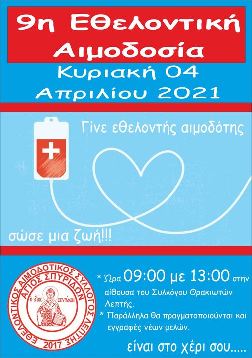 Ο Εθελοντικός – Αιμοδοτικός Σύλλογος Λεπτής Άγιος Σπυρίδων σας προσκαλεί στην εθελοντική αιμοδοσία που θα πραγματοποιηθεί την Κυριακή 4 Απριλίου και ώρα 09:00 έως 13:00 στην αίθουσα του συλλόγου στην κεντρική πλατεία Λεπτής