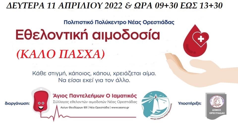 Εθελοντική αιμοδοσία στο Πολιτιστικό Πολύκεντρο Ορεστιάδας τη Δευτέρα 11 Απριλίου από τις 09:30 εώς τις 13:30