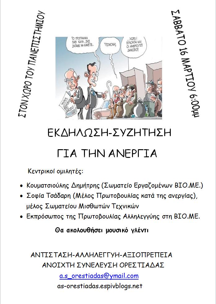 Εκδήλωση-συζήτηση για την ανεργία από την Ανοιχτή Συνέλευση Ορεστιάδας το Σάββατο 16 Μαρτίου στις 6 στο χώρο του πανεπιστημίου στην Ορεστιάδα.