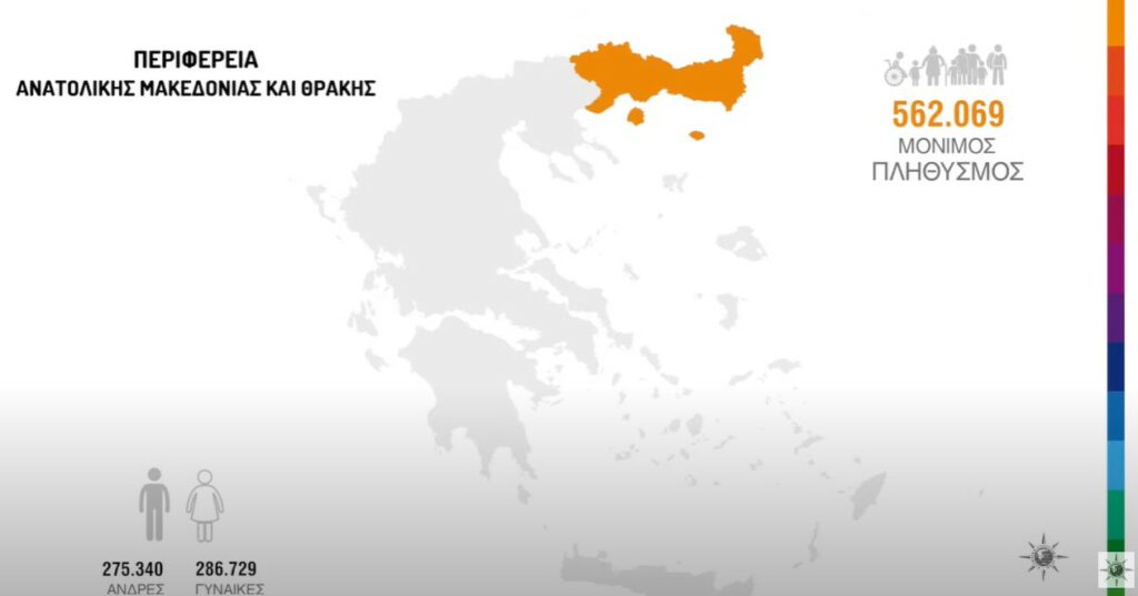 1.Ανατολική Μακεδονία- Θράκη: Πληθυσμός 562.069 άτομα από 608.182 άτομα το 2011 (μείωση 7,6%). ‘Ανδρες 275.340 άτομα από 299.643 άτομα και γυναίκες 286.729 άτομα από 308.539 άτομα.