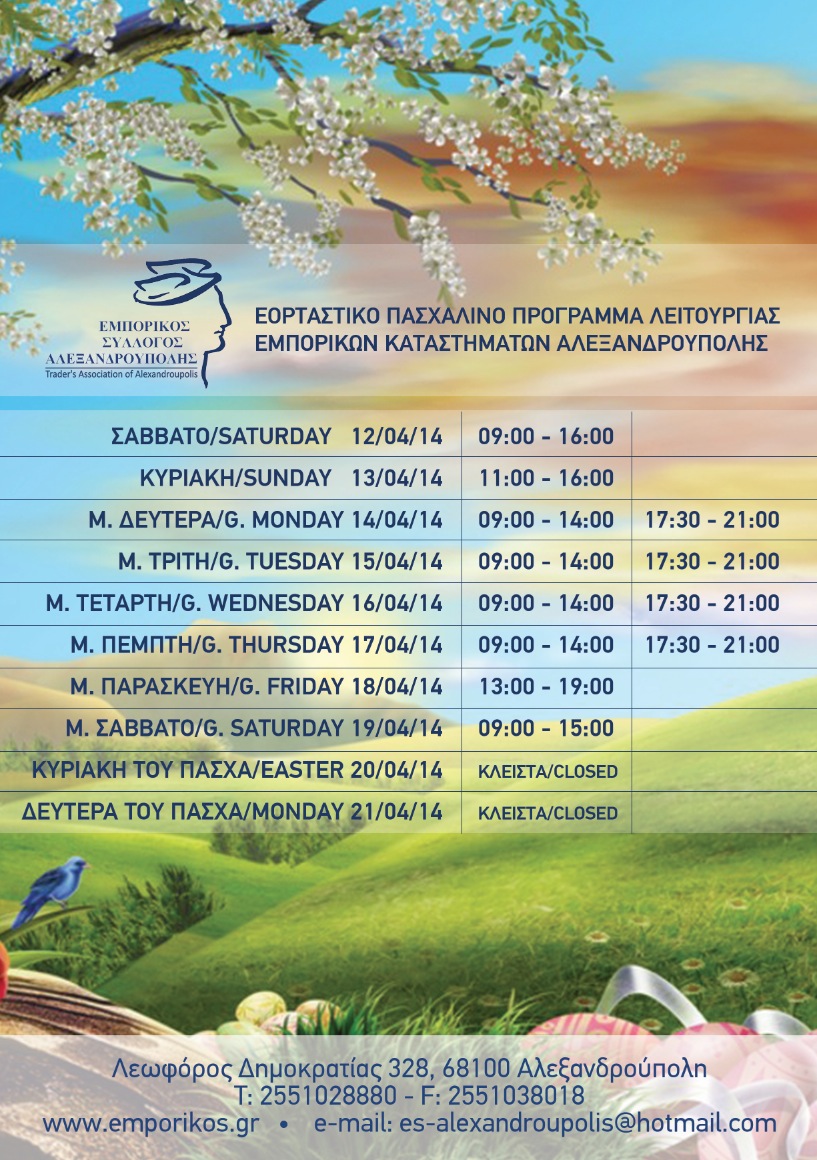 Εορταστικό Πασχαλινό πρόγραμμα λειτουργίας εμπορικών καταστημάτων Αλεξανδρούπολης