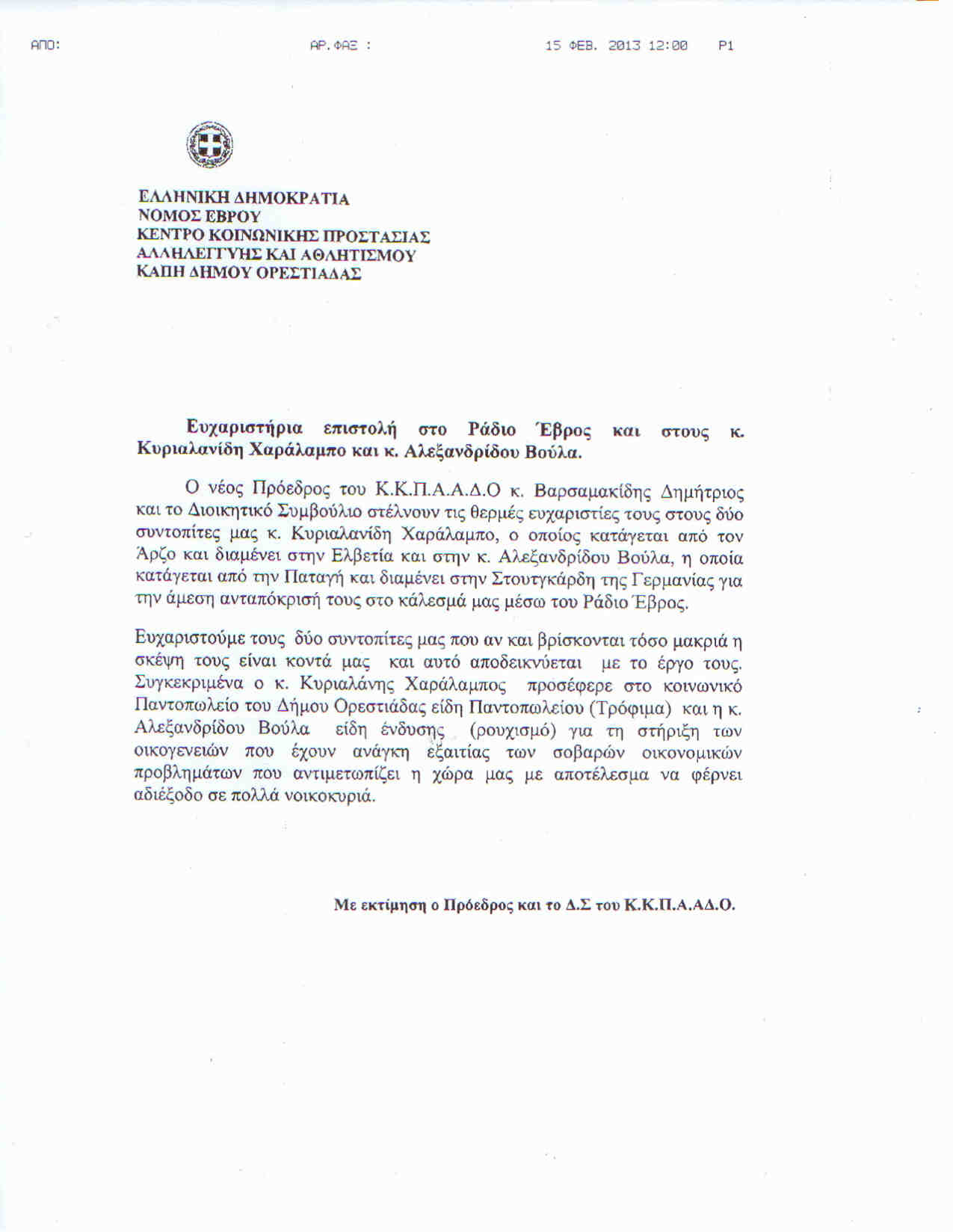 Ευχαριστήρια επιστολή απέστειλε το Δ.Σ. του Κ.Κ.Π.Α.Α.ΔΟ. σε δύο εβρίτες στην καταγωγή, κατοίκους του εξωτερικού, που ανταποκρίθηκαν στο κάλεσμα που απηύθηνε στο παρελθόν ο απερχόμενος Πρόεδρος του Κέντρου κ. Βασίλειος Δαλαμαγκίδης μέσω του Ράδιο Έβρος, το οποίο μέσα από το διαδίκτυο διαδίδει την φωνή του Έβρου σε ολόκληρο τον κόσμο.