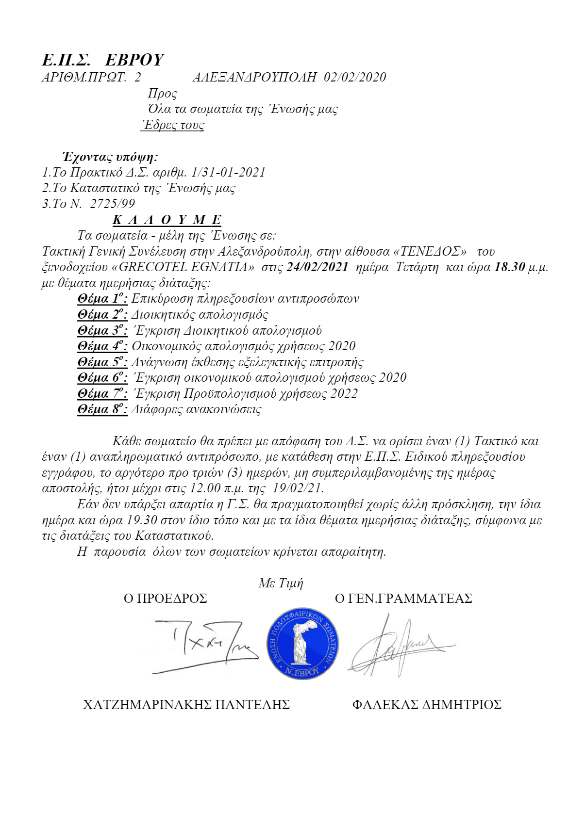 Η συνέλευση θα πραγματοποιηθεί στην αίθουσα <<ΤΈΝΕΔΟΣ>> του ξενοδοχείου <<GRECOTEL EGNATIA>> στις 24/02/2021 ημέρα Τετάρτη.