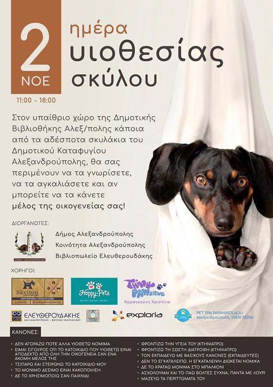 Το Σάββατο 2 Νοεμβρίου ο Δήμος Αλεξανδρούπολης, η Κοινότητα Αλεξανδρούπολης και το Καταφύγιο Αδέσποτων Ζώων Συντροφιάς Δήμου Αλεξανδρούπολης προσκαλούν όλους τους φιλόζωους δημότες να εκδηλώσουν έμπρακτα την αγάπη τους για τα ζώα!