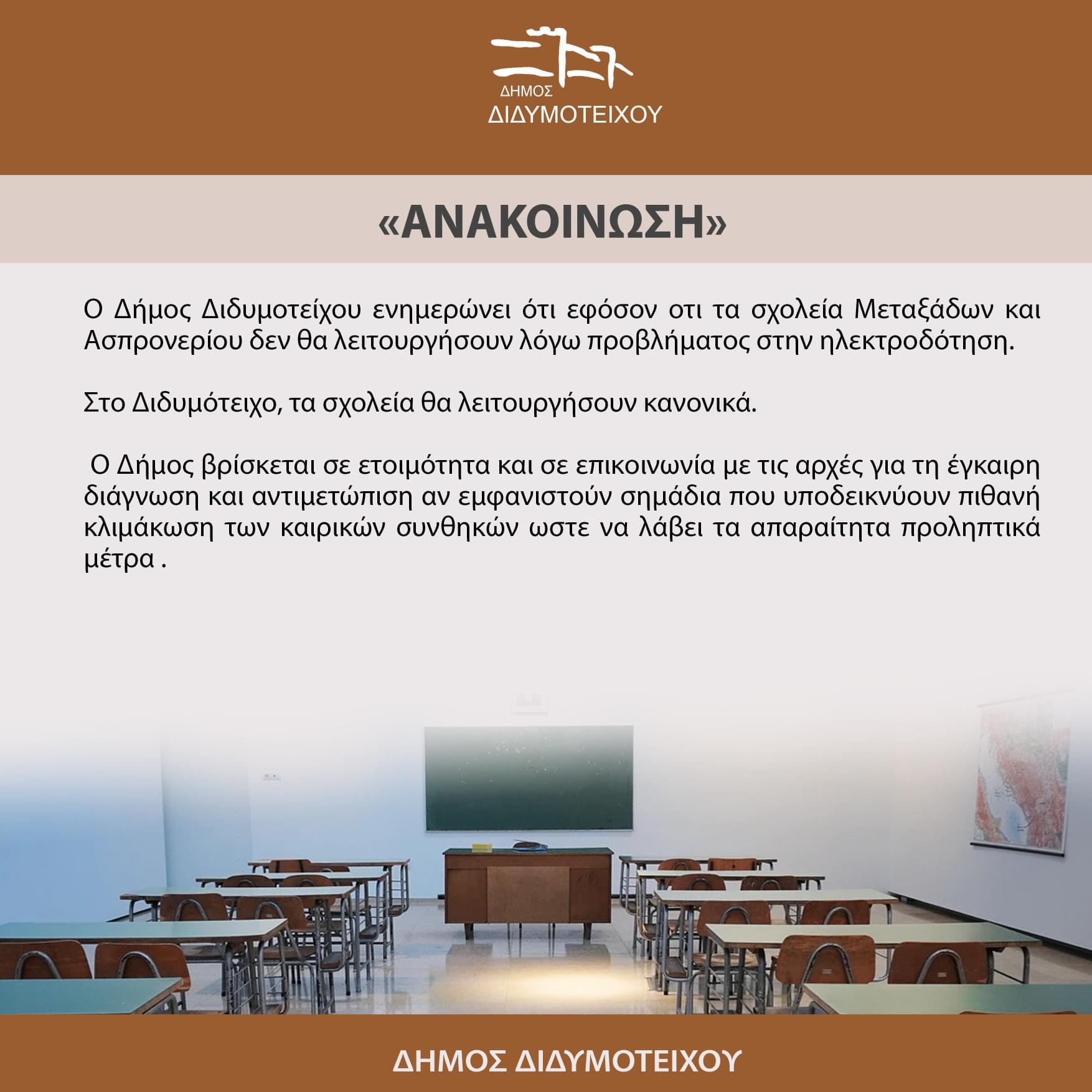 Μιλώντας στο Ράδιο Έβρος σήμερα το πρωί ο Δήμαρχος Διδυμοτείχου κ. Χατζηγιάννογλου ενημέρωσε του ακροατές ότι τα σχολεία Μεταξάδων και Ασπρονερίου θα μείνουν κλειστά. Τα σχολεία στον υπόλοιπο Δήμο Διδυμοτείχου θα λειτουργήσουν κανονικά.