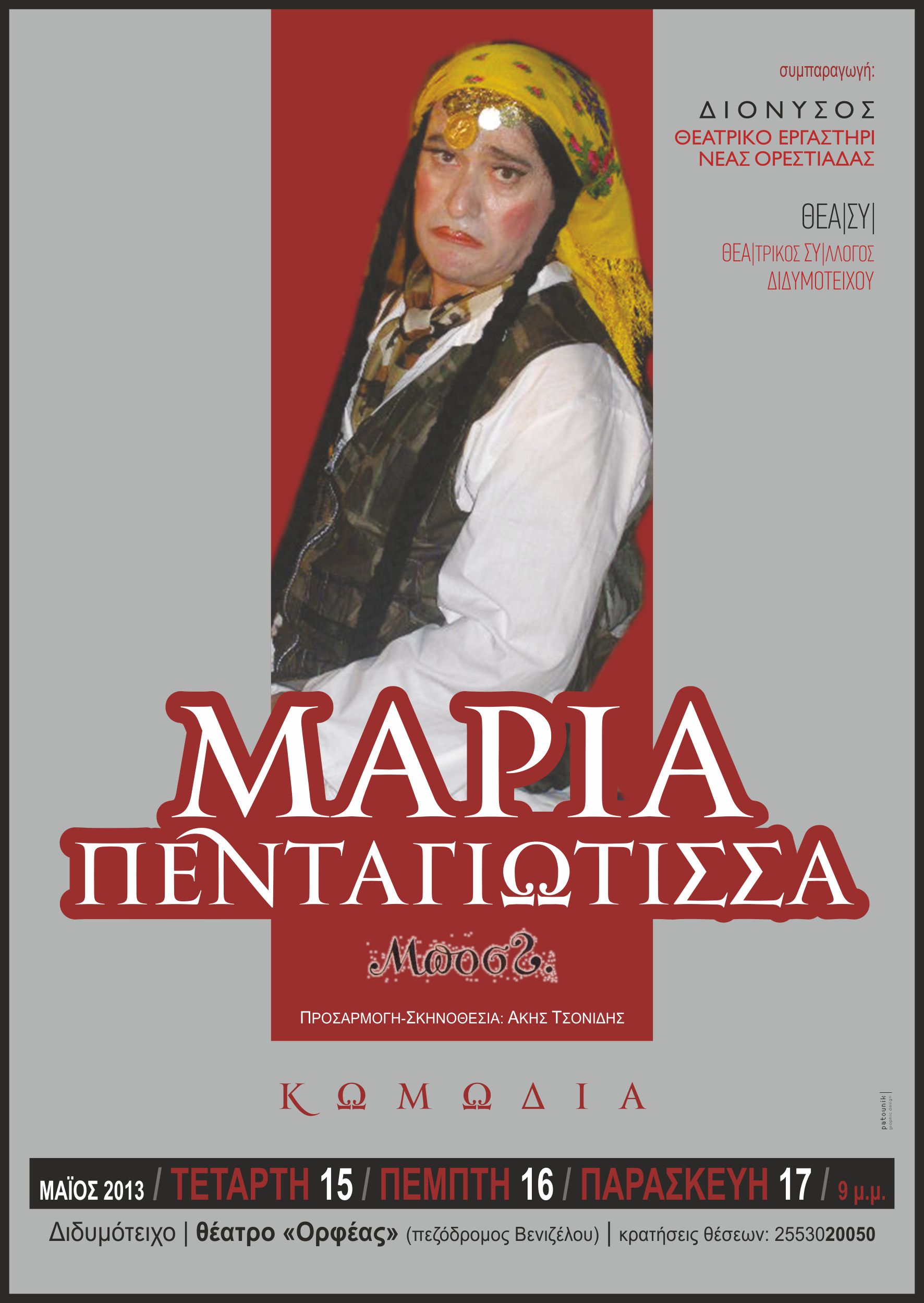 Ο ΔΙΟΝΥΣΟΣ (Θεατρικό Εργαστήρι Νέας Ορεστιάδας) και ο ΘΕΑ|ΣΥ| (Θεατρικός Σύλλογος Διδυμοτείχου, ενώνουν τις δυνάμεις τους και παρουσιάζουν την απολαυστική κωμωδία του Μποστ “Μαρία Πενταγιώτισσα”.