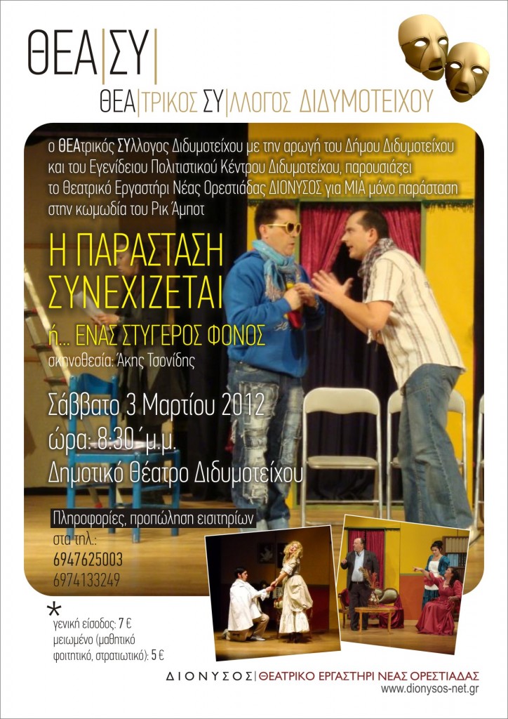 Μια ακόμη εξαιρετική βραδιά από τον ΘΕΑ.ΣΥ.Διδυμοτείχου στο Διδυμότειχο. Θέλουμε να βλέπουμε καλό θέατρο, να γελάμε, να ερχόμαστε πιο κοντά ο ένας στον άλλο, να επικοινωνούμε, ειδικά αυτές τις δύσκολες μέρες για όλους.Απολαυστική κωμωδία λοιπόν, το Σάββατο 3 Μαρτίου 2012 στις 8.30 το βράδυ στο Δημοτικό Θέατρο Διδυμοτείχου.
