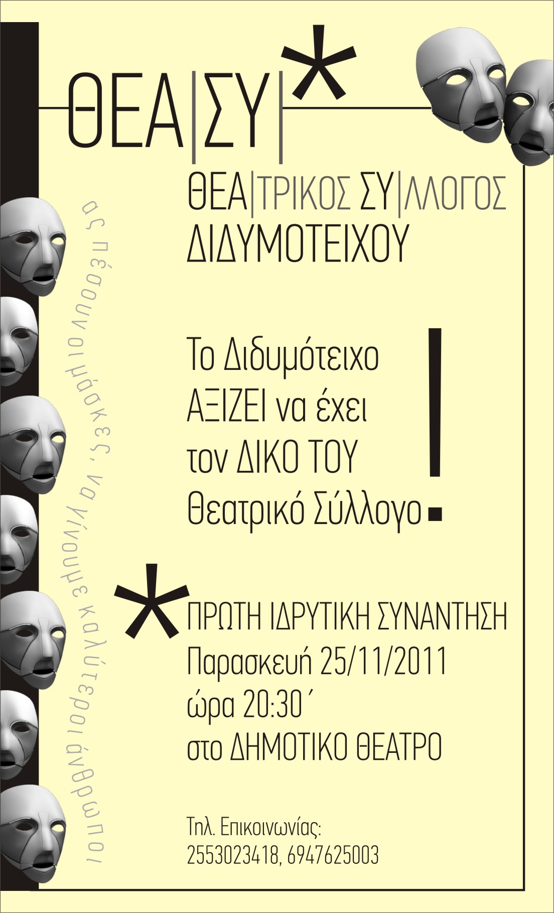 Με εναρκτήριο μήνυμα: «Ας πέσουν οι μάσκες, να γίνουμε καλύτεροι άνθρωποι» σας περιμένουμε, γιατί το Διδυμότειχο ΑΞΙΖΕΙ να έχει το ΔΙΚΟ ΤΟΥ Θεατρικό Σύλλογο.
