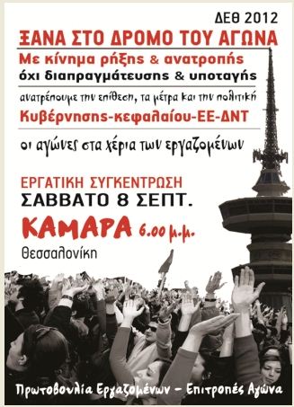 Εμείς θα είμαστε στο Ανεξάρτητο Ταξικό Κάλεσμα πλάι στους συναγωνιστές μας στην Χαλκιδική που παλεύουν ενάντια στους χρυσοθήρες, πλάι στους απολυμένους του ΜΕΤΡΟ στην Θεσσαλονίκη, στους εργαζόμενους της WIND, της ΒΙ.ΕΚ. πλάι στα πρωτοβάθμια σωματεία και τις συνελεύσεις πόλεων και γειτονιών. Εκεί είναι η φυσική μας θέση γιατί με όλους αυτούς μοιραζόμαστε κοινά προβλήματα, αγωνίες και έχουμε τον κοινό σκοπό της ανατροπής της βάρβαρης πολιτικής των μνημονίων. Η πορεία της ΔΕΘ πρέπει να ξεπεράσει τον εθιμοτυπικό κινηματικό ρόλο της. Να την μετατρέψουμε στην πρώτη μαζική, μαχητική αντικυβερνητική διαδήλωση. Αυτό θα είναι το πρώτο μήνυμα στον πόλεμο που μας έχουν κηρύξει. Μέσα από τις στάχτες της πολικής που εφαρμόζουν ΔΗΛΩΝΟΥΜΕ ΠΑΡΩΝ. Με τα δικά μας αμεσοδημοκρατικά όργανα απέναντι στον κοινοβουλευτικό ολοκληρωτισμό. Με την αλληλεγγύη σε κάθε θύμα του ιμπεριαλιστικού τους πολέμου που αναζητά την νέα ελπίδα.