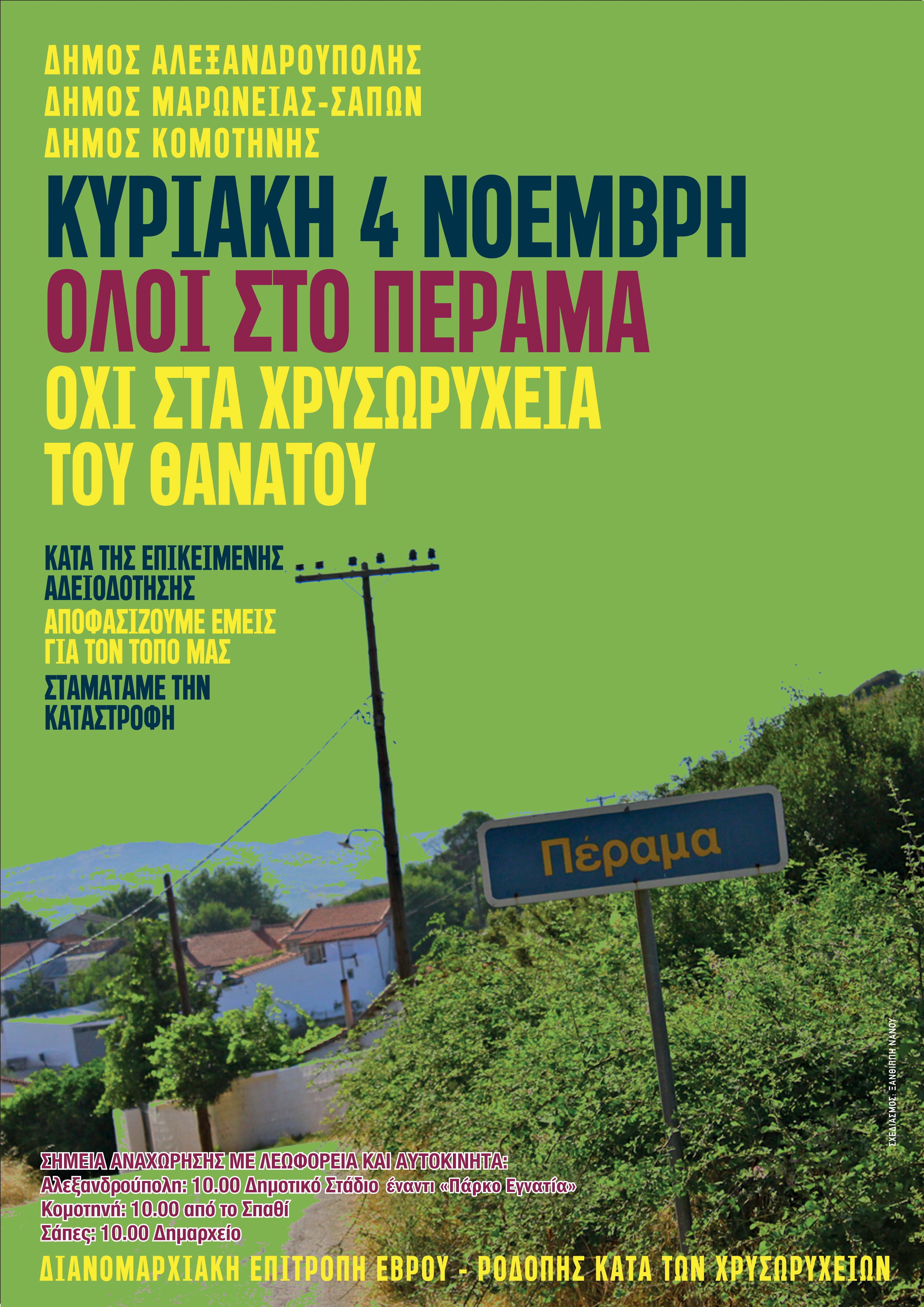 Το Πέραμα, το Κιλκίς, τις Σάπες, τη Χαλκιδική, ολόκληρη την Βόρεια Ελλάδα προσπαθούν να την μετατρέψουν σε ένα απέραντο χρυσωρυχείο στις υπηρεσίες της Καναδικής Eldorado Gold και του Μπόμπολα. Αυτό είναι το σχέδιο της Κυβέρνησης η οποία αγνοώντας σκόπιμα την εκφρασμένη αντίδραση πολιτών, φορέων και επιστημόνων ξεπουλά την δημόσια γη και περιουσία στους επίδοξους χρυσοθήρες.