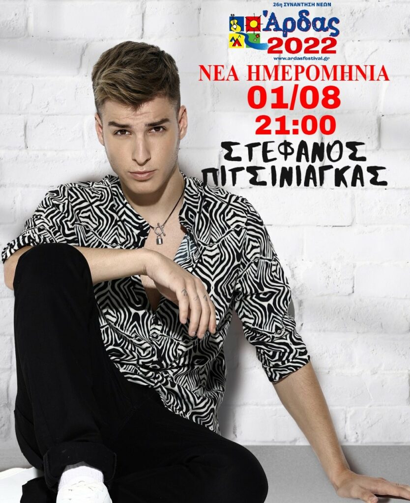 Ο Στέφανος Πιτσίνιαγκας έρχεται στο Φεστιβαλ του Άρδα να βάλει φωτιά στην σκηνή αλλά και τη διασκέδαση.Ο αγαπητός σε όλους νέος τραγουδιστής Στέφανος Πιτσίνιαγκας έρχεται με επιτυχίες αλλά και με νέο, άκρως καλοκαιρινό τραγούδι που θα ξεσηκώσει. Ο νεαρός τραγουδιστής κέρδισε πέρυσι τον μουσικό διαγωνισμό του ΣΚΑΪ, «House of fame» κατάφερε να ξεχωρίσει στο ελληνικό πεντάγραμμο κάνοντας Χιτ το πρώτο του τραγούδι. Ένα τραγούδι που έγινε viral μέσα σε λίγα 24ωρα.