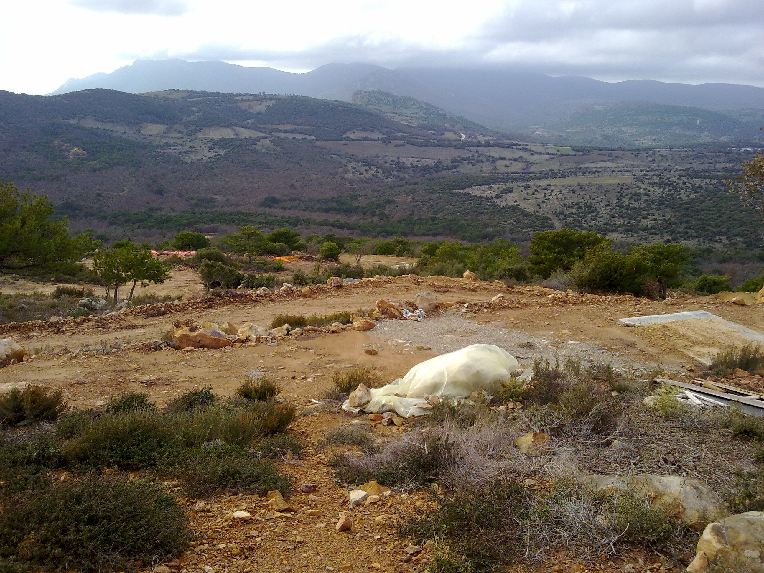 4)Στην ίδια περιοχή διαπιστώσαμε ότι έχουν κατασκευασθεί τσιμεντένιες βάσεις– δάπεδα μέσα σε έκταση δασικού χαρακτήρα. Αγνοούμε αν στα πλαίσια των ερευνητικών εργασιών της “Χρυσωρυχεία Θράκης ΑΕ” κάποια δημόσια αρχή νομιμοποίησε τον αφανισμό ορισμένων δασικών εδαφών και την υποκατάστασή τους με τσιμεντένιες επιφάνειες.