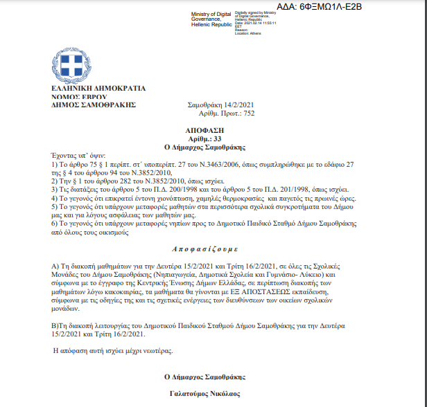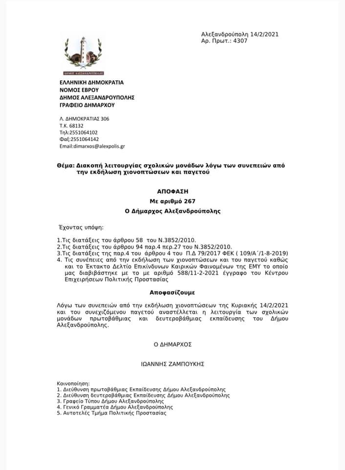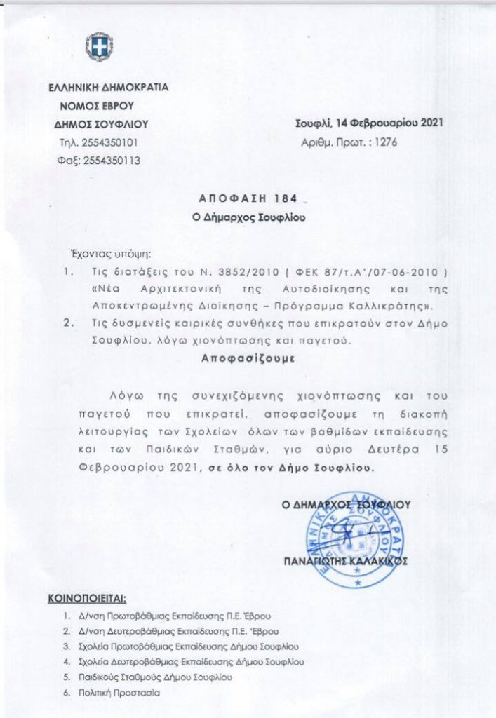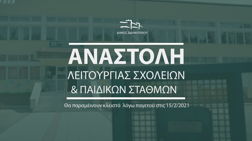 Αύριο Δευτέρα 15/2/2021 τα σχολεία θα είναι ΚΛΕΙΣΤΑ σε όλο τον Έβρο .