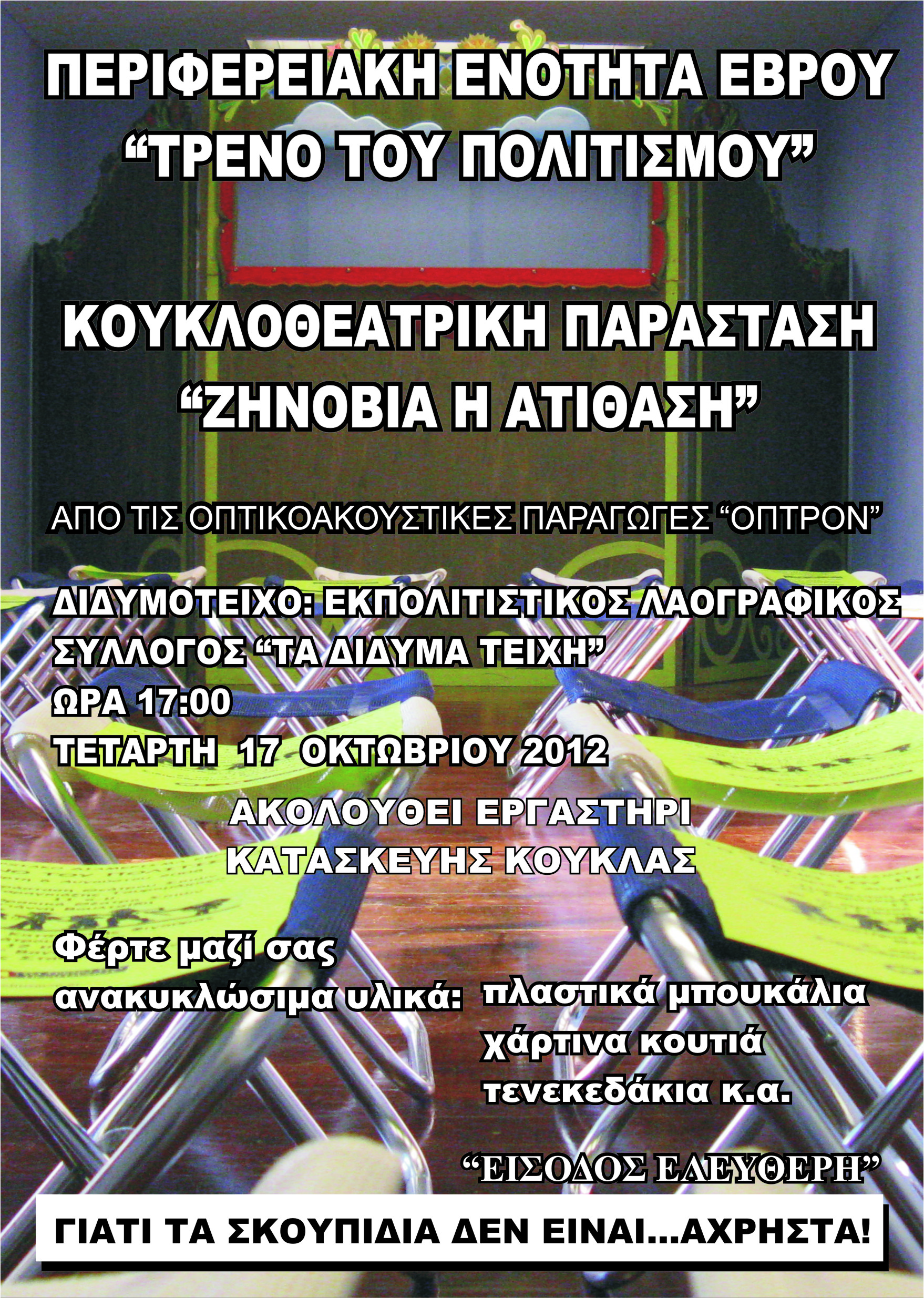 Η Περιφερειακή Ενότητα Έβρου στο πλαίσιο του προγράμματος «Τρένο του Πολιτισμού» διοργανώνει μια σειρά από δράσεις κουκλοθεάτρου από τον Αύγουστο έως το Νοέμβριο του 2012, σε συνεργασία με τη Γενοβέφα Κτενίδου και τις οπτικοακουστικές παραγωγές «ΟΠΤΡΟΝ». Οι δράσεις περιλαμβάνουν την παράσταση «Ζηνοβία η Ατίθαση» και εργαστήρι κατασκευής κούκλας κουκλοθεάτρου με ανακυκλώσιμα υλικά.
