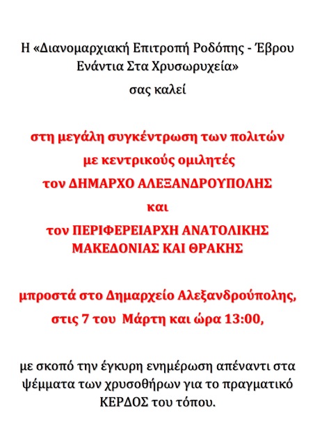 Συγκέντρωση διαμαρτυρίας θα πραγματοποιήσει η Διανομαρχιακή Επιτροπή Ροδόπης Έβρου Ενάντια στα Χρυσωρυχεία μπροστά στο δημαρχείο Αλεξανδρούπολης την Τετάρτη 7 Μαρτίου στις 13:00″με σκοπό την έγκυρη ενημέρωση απέναντι στα ψέμματα των χρυσοθήρων για το πραγματικό Κέρδος του τόπου.