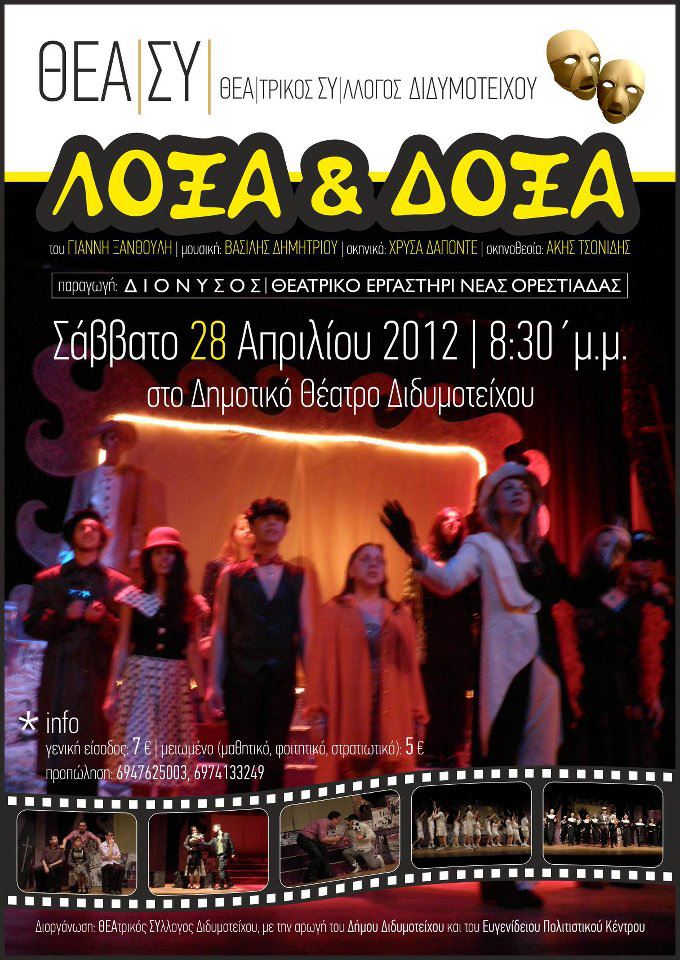 Το Σάββατο 28/4/2012 στις 8.30 το βράδυ ο ΘΕΑτρικός ΣΥλλογος Διδυμοτείχου παρουσιάζει το Θεατρικό Εργαστήρι Ν.Ορεστιάδας ΔΙΟΝΥΣΟΣ με το θεατρικό έργο “ΛΟΞΑ ΚΑΙ ΔΟΞΑ” του Γιάννη Ξανθούλη, σε εκπληκτική πρωτότυπη μουσική Βασίλη Δημητρίου στο Δημοτικό Θέατρο Διδυμοτείχου για μία μόνο παράσταση.