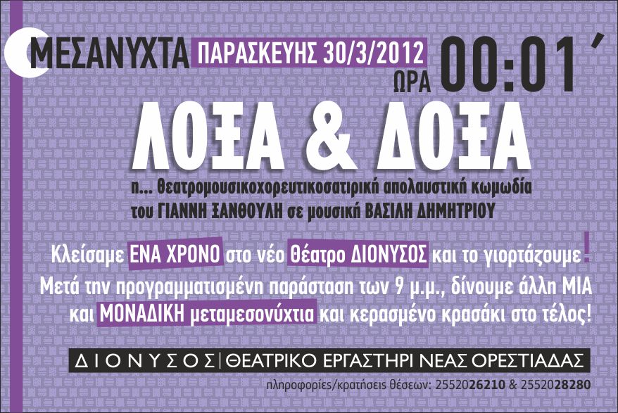 Μεταμεσονύχτια παράσταση την Παρασκευή 30/3/2012 διοργανώνει το Θεατρικό Εργαστήρι Ορεστιάδας με αφορμή τον ένα χρόνο λειτουργίας του θεάτρου Διόνυσος που αποτελεί και έδρα του θεατρικού εργαστηρίου.Η παράσταση που θα δοθεί είναι μία μουσικοχορευτικοσατιρική κωμωδία του Γιάννη Ξανθούλη σε μουσική του Βασίλη Δημητρίου με τίτλο Λόξα & Δόξα ενώ μετά το τέλος της παράσταση ο Διονυσος θα κερνάει κρασάκι για τον εορτασμό των γενεθλίων της στέγης του.