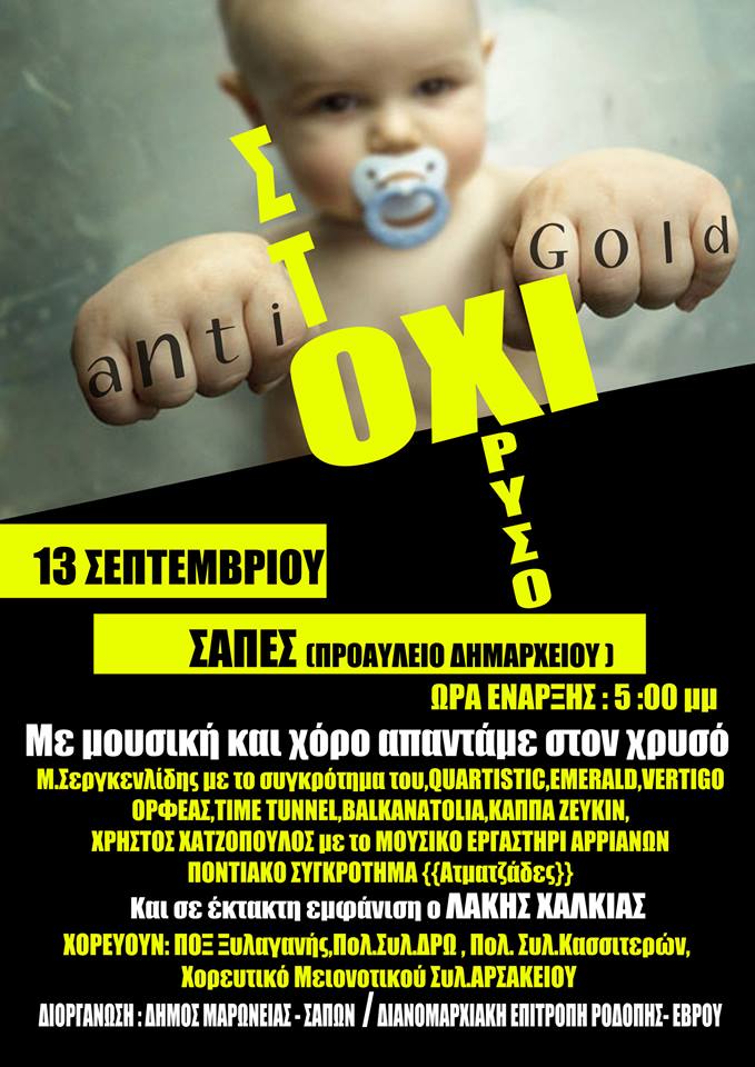 sapes_kata_toy_xrysoyjpgΜε πρωτοβουλία του Δήμου Μαρώνειας – Σαπών και την υποστήριξη της Διανομαρχιακής Επιτροπής Ροδόπης – Έβρου κατά της εξόρυξης και μεταλλουργίας χρυσού, διοργανώνεται στις Σάπες στον προαύλιο χώρο του Δημαρχείου, την Παρασκευή 13 Σεπτεμβρίου 2013, και ώρα 5.00 το απόγευμα, μια μεγάλη μουσικοχορευτική εκδήλωση διαμαρτυρίας με τίτλο «Με μουσική και χορό, απαντάμε στο χρυσό».