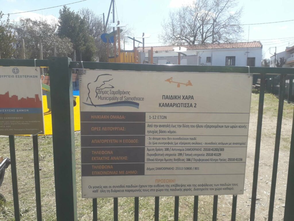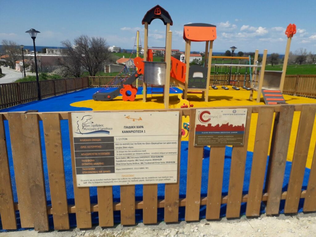 Δύο νέες παιδικές χαρές απέκτησε η Σαμοθράκη, μία στον οικισμό της Καμαριώτισσας και μια στα Αλώνια, ενώ τάπητες τοποθετήθηκαν στις δύο υφιστάμενες παιδικές χαρές στο Λάκκωμα και στην Καμαριώτισσα.