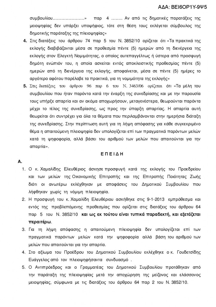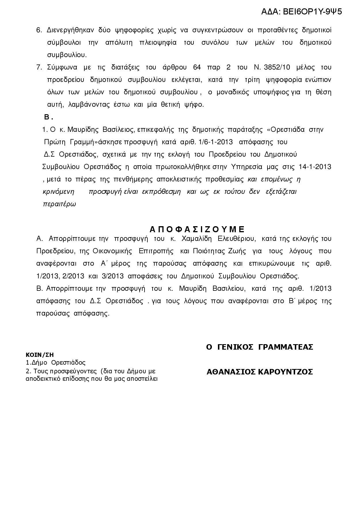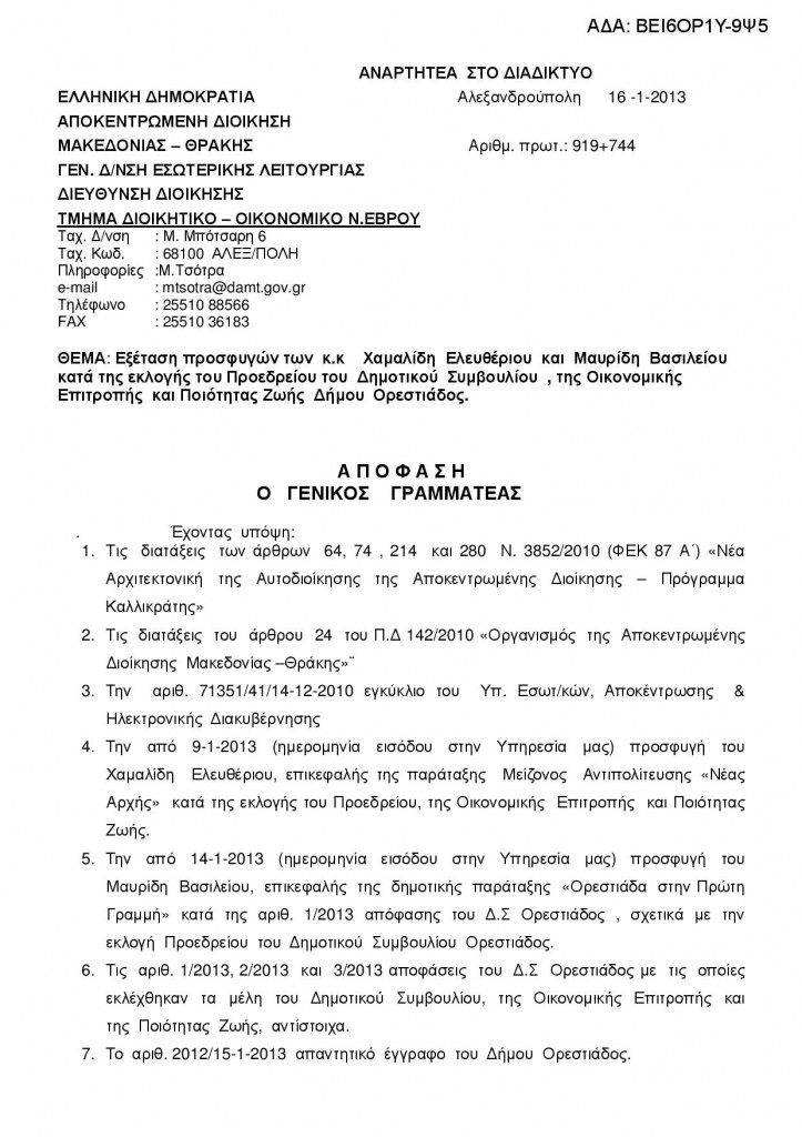 “Νόμιμη είναι η εκλογή του προέδρου του Δημοτικού Συμβουλίου Ορεστιάδας κ.Γκουδετσίδη κατά τις δημαιρεσίες της 6ης Ιανουαρίου 2013”.Αυτή είναι η απόφαση της Αποκεντρωμένης Περιφέρειας Μακεδονίας – Θράκης ,που εξέτασε την ένσταση της αντιπολίτευσης ,και κοινοποιήθηκε αργά εχθές το απόγευμα.Οι επικεφαλής των παρατάξεων “Νέα Αρχή” κ.Χαμαλίδης και “Ορεστιάδα στην Πρώτη Γραμμή” κ.Μαυρίδης τόνισαν στο Ράδιο Έβρος και στην εκπομπή Ματιές στην Ενημέρωση με τη Σούλα Καπετανίδου ότι θα προσφύγουν στο δευτεροβάθμιο όργανο καθώς αμφισβητούν την ορθότητα της απόφασης της Αποκεντρωμένης Διοίκησης Μακεδονίας Θράκης.