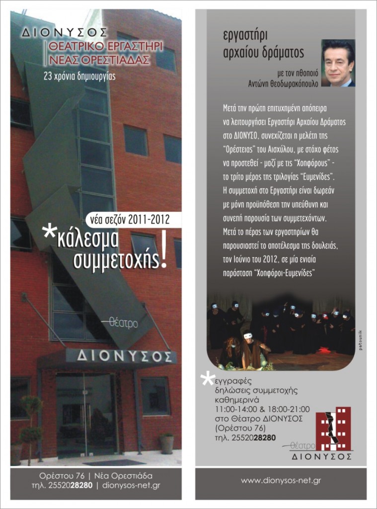 Φυσικά για φέτος ο “ΔΙΟΝΥΣΟΣ” συνεχίζει την περσινή,επιτυχημένη, απόπειρα για τη δημιουργία εργαστηρίου αρχαίου δράματος υπό την καθοδήγηση του ηθοποιού Αντώνη Θεοδωρακόπουλου.Το φετινό έργο που θα μελετήσει το εργαστήρι αρχαίου δράματος είναι το τρίτο μέρος της τριλογίας της Ορέστειας του Αισχύλου οι Ευμενίδες.