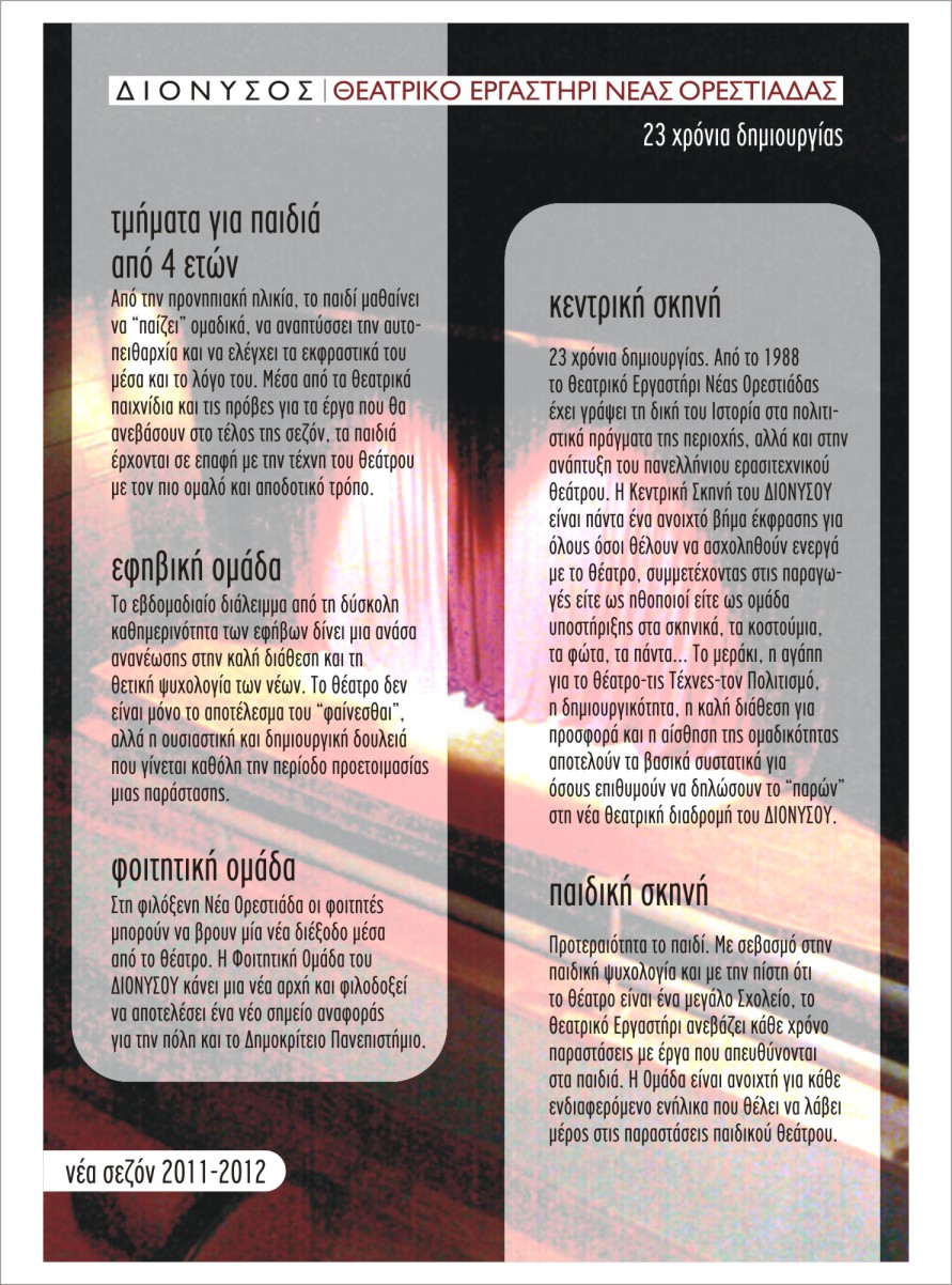Με ένα πλήρες πρόγραμμα ξεκινάει τη σεζόν 2011-2012 το θεατρικό εργαστήρι Ορεστιάδας Διόνυσσος.