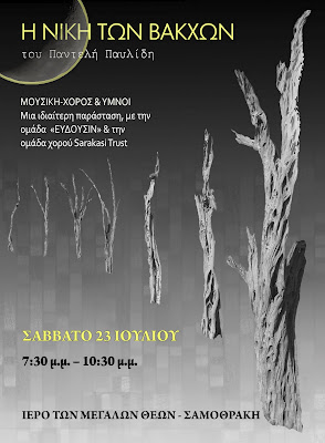 Στο πλαίσιο των εκδηλώσεων “ΠΑΙ2011” εντάσσεται και η μουσικο-χορευτική παράσταση “Η Νίκη των Βακχών” του Παντελή Παυλίδη που θα κάνει πρεμιέρα στις 7.30 μ.μ. το Σάββατο, 23 Ιουλίου, στο Ιερό των Μεγάλων Θεών. Πρόκειται για μια ιδιαίτερη παράσταση με την ομάδα “ΕΥΔΟΥΣΙΝ” και το χορευτικό σχήμα sarakasi trust. …Η Νίκη των Βακχών» αποτελεί μία μοναδική παράσταση, γιατί εξιστορείται κατά τον τρόπο της αρχαίας τραγωδίας από το μουσικό σχήμα «ΕΥΔΟΥΣΙΝ», χορευτές από την Ελλάδα, την ομάδα χορού Sarakasi Trust, από το Ναϊρόμπι της Κένυας και την Ινδή κορυφαία χορεύτρια Radhika Shah που με το σώμα και τη φωνή τους, μετουσιώνουν τα μηνύματα του έργου και αναδεικνύουν την ιστορία του Διονύσου από τον Ευριπίδη.