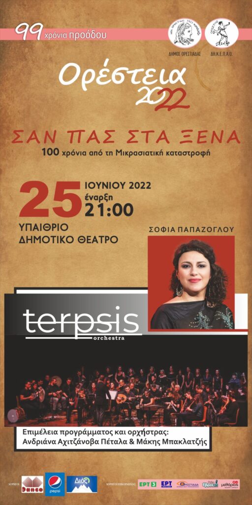 Η πολυμελής ορχήστρα «Terpsis Orchestra» αποτελούμενη από παραδοσιακά όργανα, υπό την επιμέλεια των Ανδριάνα Αχιτζάνοβα και Μάκη Μπακλατζή, σε συνεργασία με την ερμηνεύτρια Σοφία Παπάζογλου, παρουσιάζουν τη μουσική εκδήλωση Σαν πας στα ξένα. Η εκδήλωση αποτελεί ένα μουσικό αφιέρωμα για τα εκατό χρόνια από τη μικρασιατική καταστροφή, με τραγούδια και παραδοσιακούς σκοπούς με θεματολογία τη ζωή στη Σμύρνη, την μεγάλη καταστροφή και την προσφυγιά. Ένα μουσικό ταξίδι πίσω στο χρόνο που ζωντανεύει μνήμες, εικόνες και ήχους από τη Μικρά Ασία.